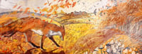 This autumnal scene features a beautiful red fox caught in a sudden storm. Ludlow castle features in the background with seasonal inkcap mushrooms and swirling oak leaves creating an atmospheric and windswept piece.
