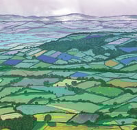 A striking fox trots confidently across a rainbow coloured landscape. The piece captures a scene looking west towards Wales from the top of Titterstone, Clee Hill in Shropshire. The patchwork-blanket style landscape is a classic British pastoral scene with hills and hedgerows stretching off into the distance.