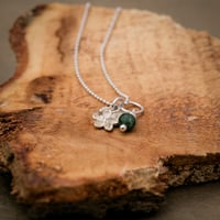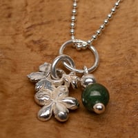 This delicate pendant features a hallmarked geranium flower charm and a tiny moss agate bead on a silver ball chain.