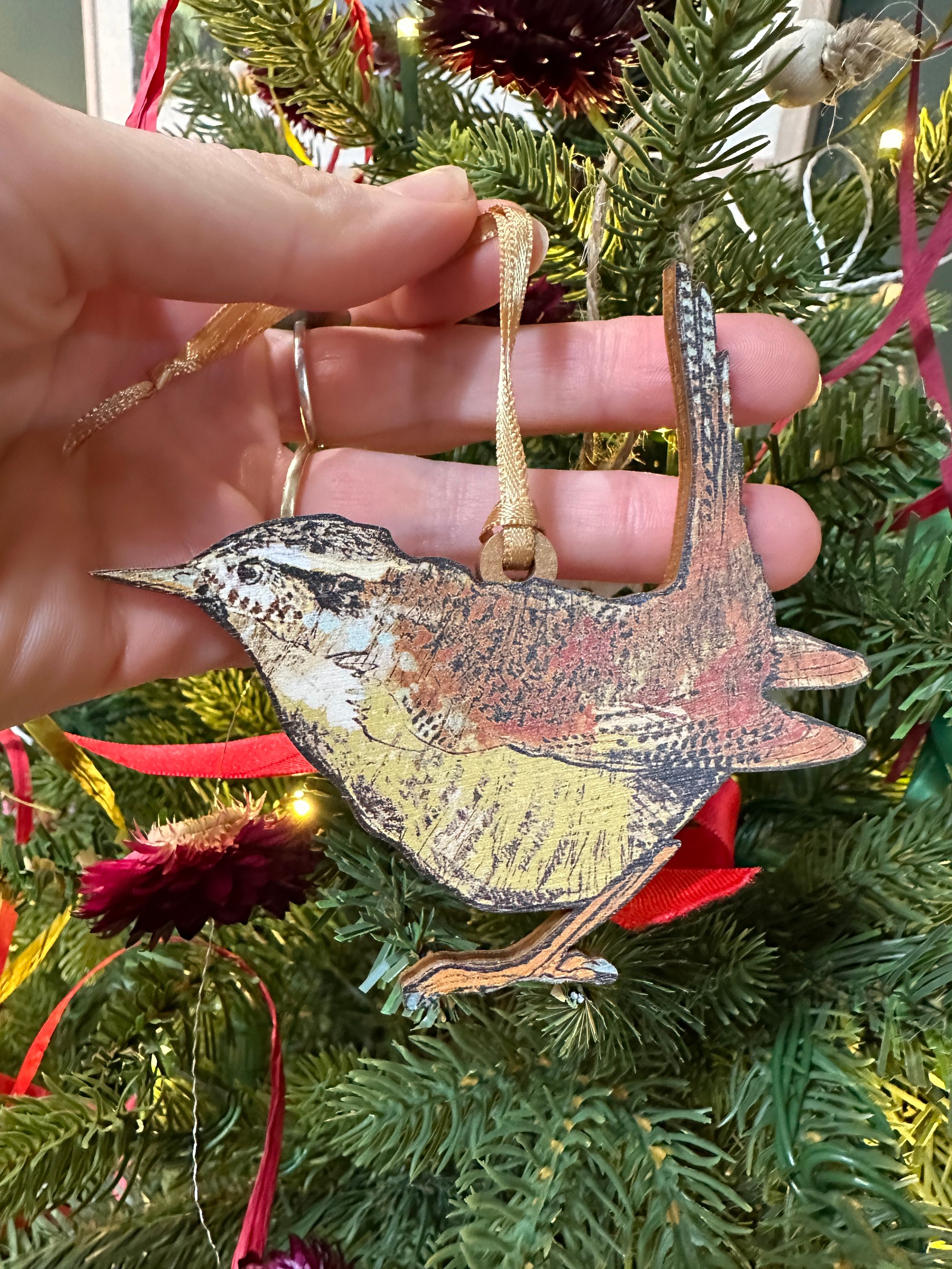 Wooden wren decoration measuring 9.5cm at its longest point.